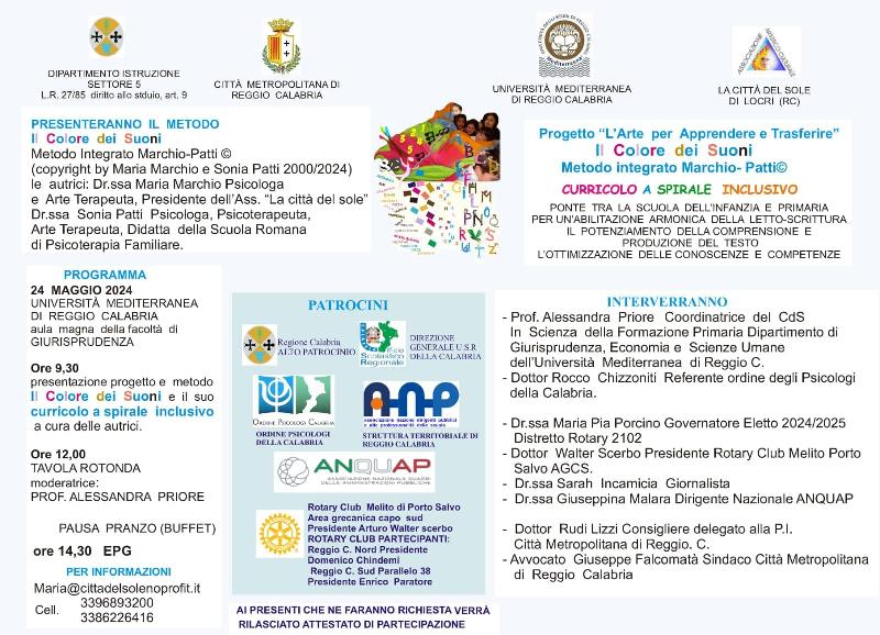 Dip. DiGiES -Università degli Studi Mediterranea di Reggio Calabria, le dottoresse Maria Marchio e Sonia Patti co ideatrici del metodo IL COLORE DEI SUONI" hanno presentato il metodo, nella tavola rotonda sono intervenuti: Dott. ROCCO CHIZZONITI